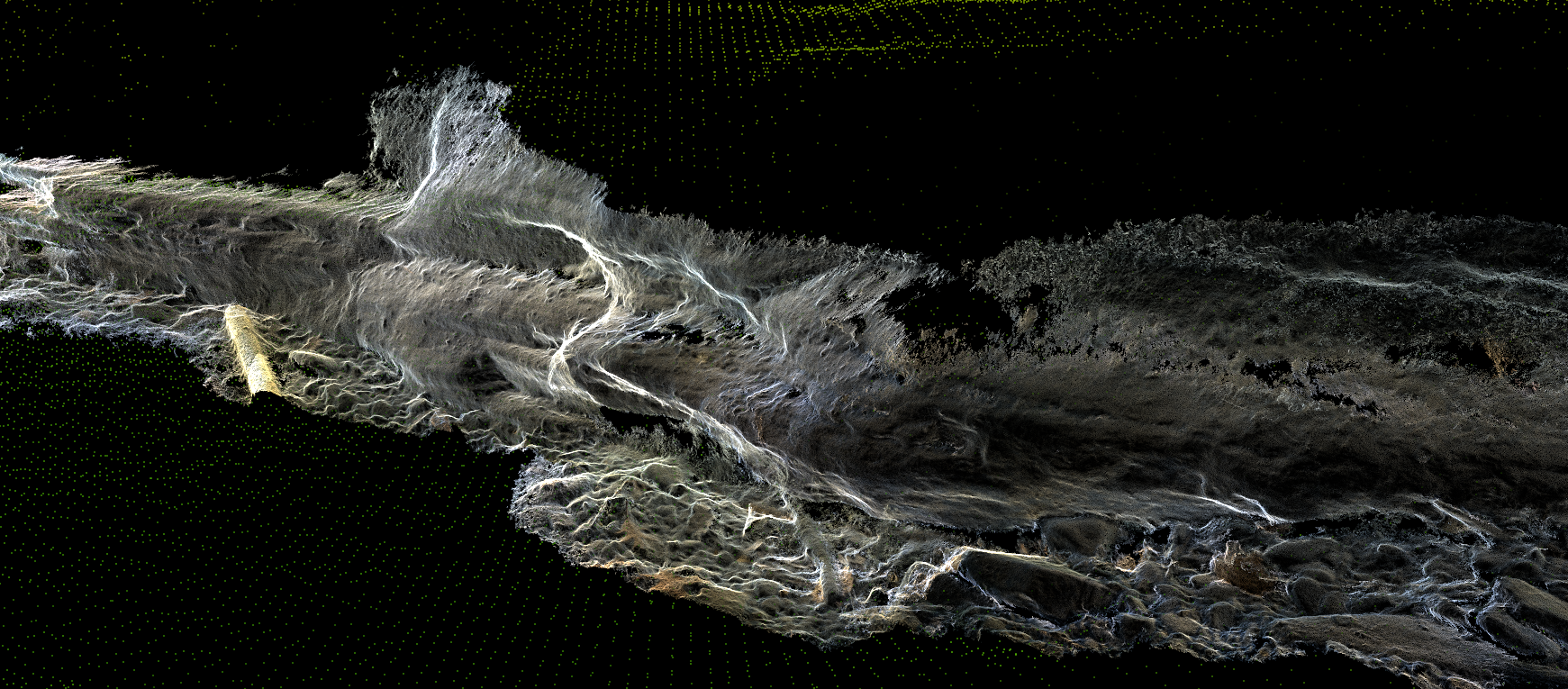• 3D point cloud image of a river dam inspection area with the caption "ROV Collected 3D Photogrammetry (Inspection Area: TOE OF DAM)" and the logo of the University of Alaska Fairbanks (UAF).